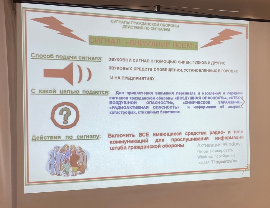 Специалисты центра ознакомили участников с общими правилами поведения при возникновении чрезвычайных ситуаций. Объяснили, что необходимо развивать навыки безопасного поведения и действий в случае возникновения чрезвычайных ситуаций природного и техногенного характера, а также воспитывать в себе чувство патриотизма и любви к Родине. Все участники с большим вниманием ознакомились со стендом по гражданской обороне, прослушали полезный материал и посмотрели на экране слайды по гражданской обороне. Хочется надеяться, что они будут соблюдать и применять все знания по безопасной жизнедеятельности, беречь своё здоровье, а мы в дальнейшем будем продолжать эту работу, ведь наша задача предупредить, научить, помочь!